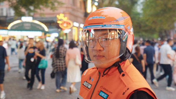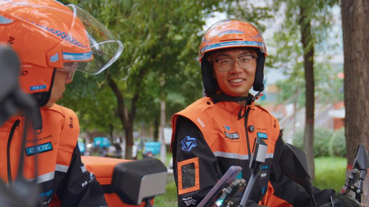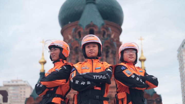 橙黑拼接的吸睛配色、帅气干练的倒三角版型、存在感极强的魔术贴logo,外卖骑士们换上新制服,让人乍一看还以为是F1走入现实。